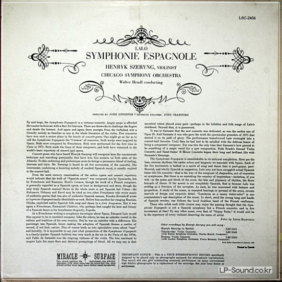 SZERYNG, LALO SYMPHONIE ESPAGNOLE, HENDL, CHICAGO SYMPHONY LSC 2456 > 협주곡