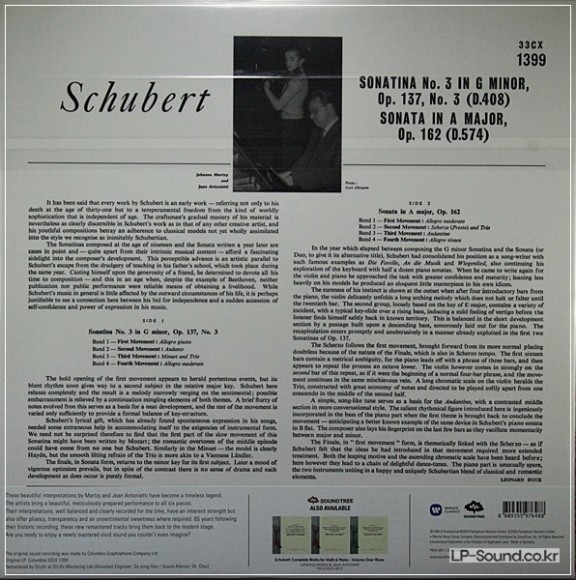 SHUBERT: VIOLIN SONATA NO1/2 JOHANNA MARTZY, 33CX 1372 LP3 > 독주곡