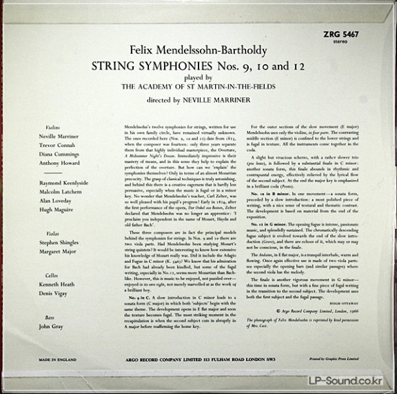 MENDELSSOHN: STRING SYMPHONIES - MARRINER **ARGO OVAL ZRG 5467 ED1 > 실내악곡