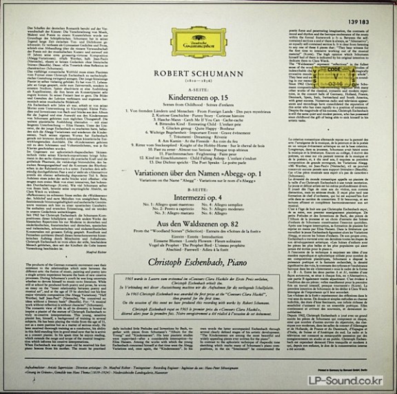SCHUMANN SCENES FROM CHILDHOOD PIANO SOLOESCHENBACH DGG STEREO SLPM 139183 > 독주곡