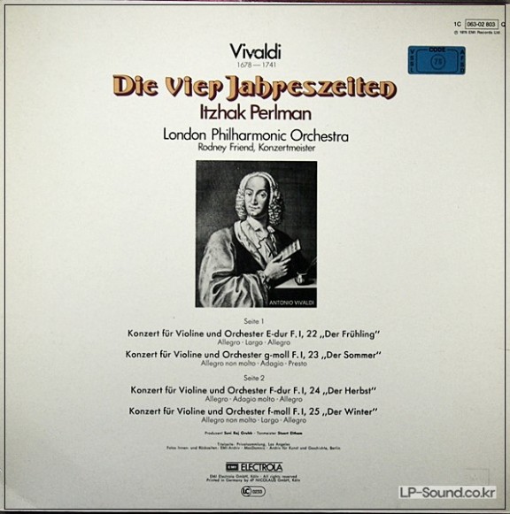 VIVALDI. THE FOUR SEASONS. ITZHAK PERLMAN. LONDON PHILHARMONIC 063 02803 > 실내악곡
