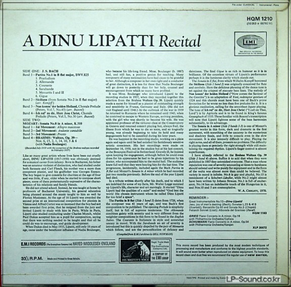 A DINU LIPATTI RECITAL BACH MOZART BRAHMS EMI ODEON HQM 1210 > 독주곡