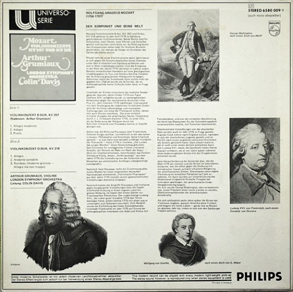 • MOZART: VIOLIN CONCERTOS K.207 & K.218 / GRUMIAUX / DAVIS / PHILIPS 6580 009